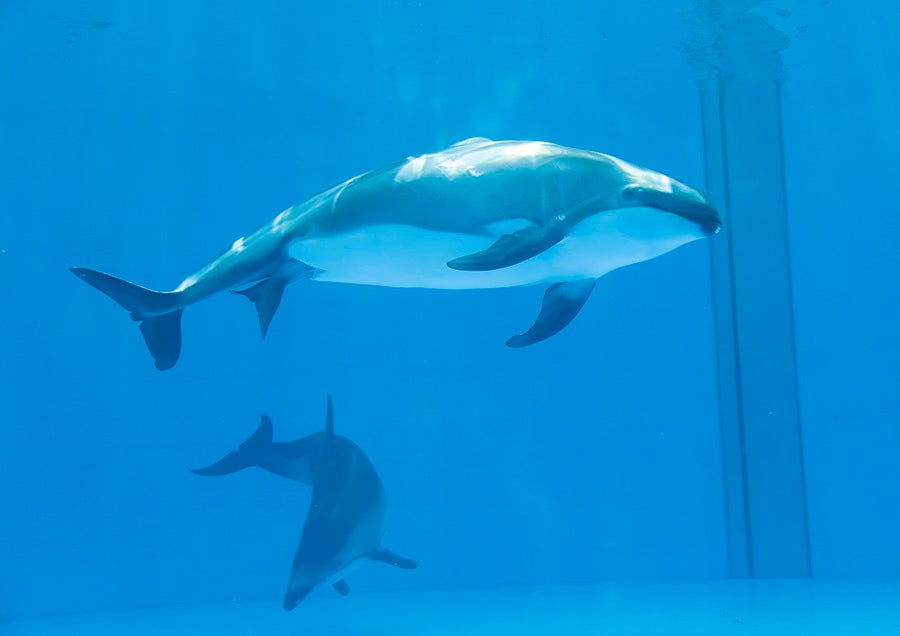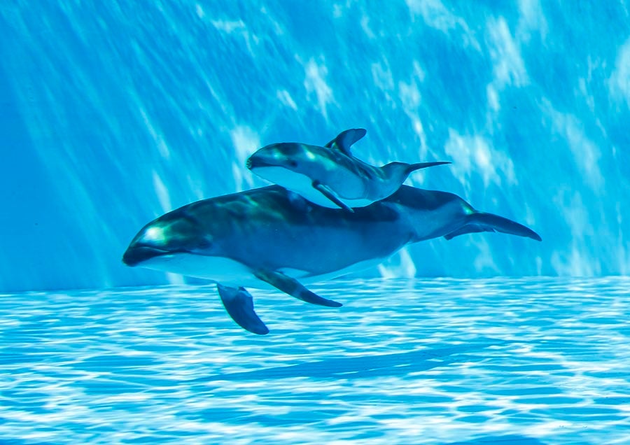 イルカの出産は真夜中になることが多いですが、今回の母親「ローラ」は夕暮れが近づく15時02分に破水して出産が始まり、16時23分に赤ちゃんを産み落としました。1時間21分の分娩時間は通常より短い安産でした。誕生したカマイルカの赤ちゃんは自力で水面まで力強く泳ぐと、元気よく生まれて初めての呼吸をしました。見守っていた飼育員からは、安堵が漏れるとともに、喜びの声がきかれました。出生後数日間は母親から十分なお乳を飲めていなかったため、「ローラ」から母乳を採取して哺乳を補いましたが、現在では授乳は順調で元気に成育中です。