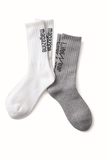 LifeWear magazineグッズとして初登場となるパイル地ソックスは、大胆に入れたロゴデザインがインパクト大。ホワイトとグレーの2色セット。