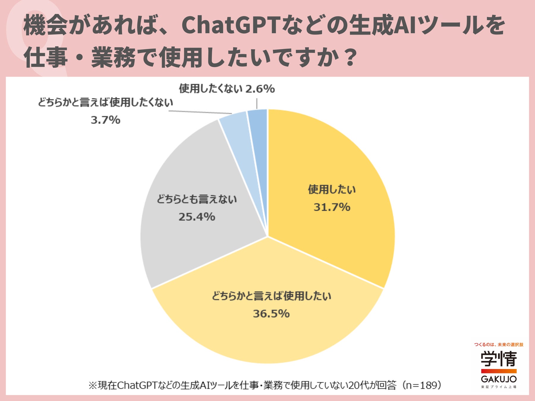株式会社学情(本社:東京都中央区)は、20代の仕事観や働く意識をひも解くために、アンケート調査を実施しました。今回は「生成AI」に関して調査。仕事・業務でのChatGPTなどの生成AI利用について、「使用している」と回答した20代は22.9%でした。「メールの文章や資料を添削してもらい、ミスの防止につなげている」「生成AIを使うと、プログラミングが効率的にできる」といった声が上がっています。使用している場面は、「文章生成」が最多でした。また、現在ChatGPTなどの生成AIツールを仕事・業務で使用していない20代のうち、生成AIの使用を希望している20代は7割に迫りました。「会議の議事録や資料作成に活用し、業務を効率化したい」「定型業務にかけている時間を短縮し、重要な業務に時間を割きたい」「仕事以外では使用したことがあり、思っていたよりも精度が高く便利だと感じた」といった声が寄せられています。