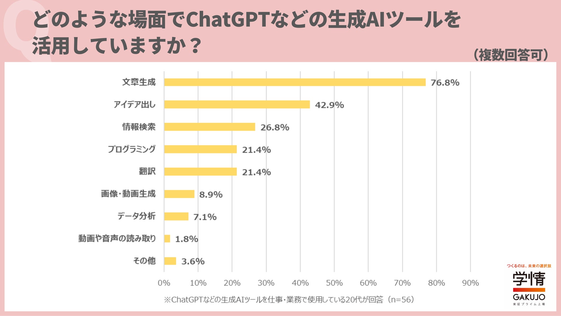 仕事・業務でChatGPTなどの生成AIを使用している場面は、「文章生成」が76.8%で最多。次いで、「アイデア出し」42.9%、「情報検索」26.8%が続きました。
