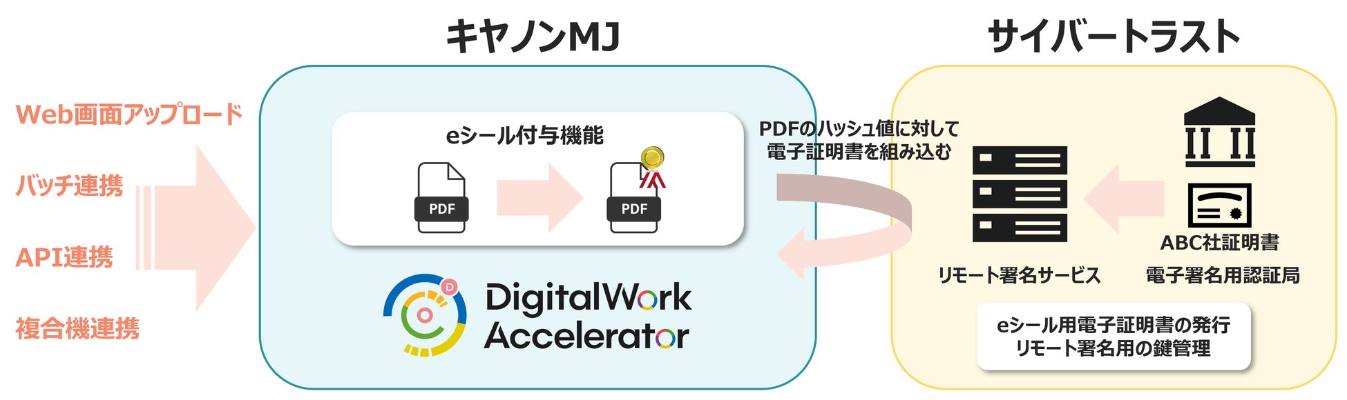 このたび、キヤノンMJとサイバートラストは、企業間でやり取りされる電子文書の安全性と信頼性の強化に向け、トラスト※3分野での協業を開始します。キヤノンMJが提供するデジタルドキュメントサービス「DigitalWork Accelerator」とサイバートラストの「iTrust リモート署名サービス」および「iTrust eシール用証明書」を連携し、「DigitalWork Accelerator」で管理するPDF形式の電子文書にeシールを自動付与する機能を2026年1月下旬より提供開始します。