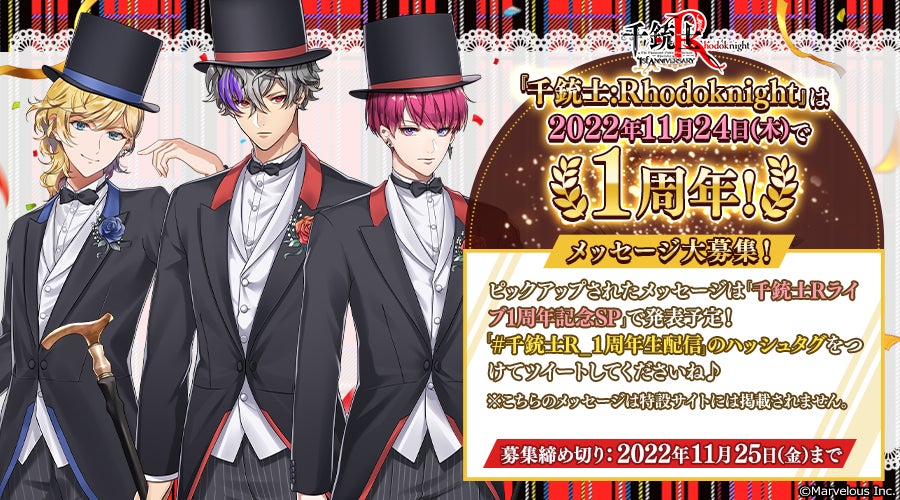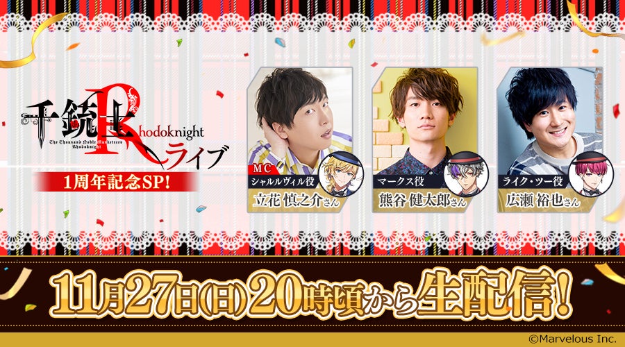 株式会社マーベラス(代表取締役社長:佐藤 澄宣/所在地:東京都品川区)による、スマートフォンゲーム『千銃士:Rhodoknight』(読み:せんじゅうし ろーどないと 以降、『千銃士R』)は、11月24日に迎える1周年を記念して、熊谷健太郎さん(マークス役)と広瀬裕也さん(ライク・ツー役)と立花慎之介さん(シャルルヴィル役)による「千銃士Rライブ1周年記念SP」を11月27日(日)20時頃からYouTubeライブにて生配信することを決定いたしました。