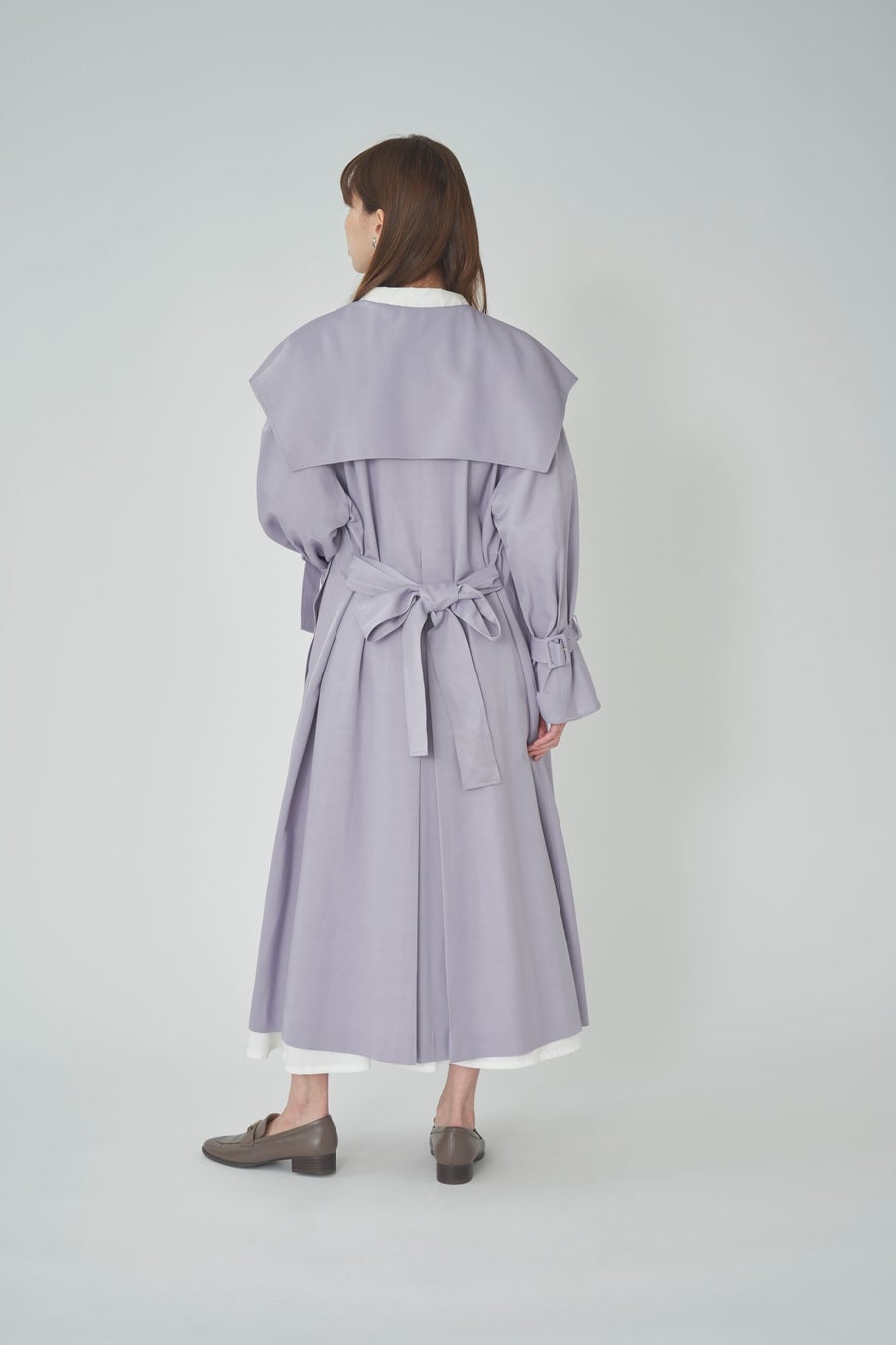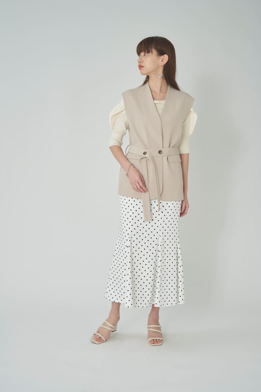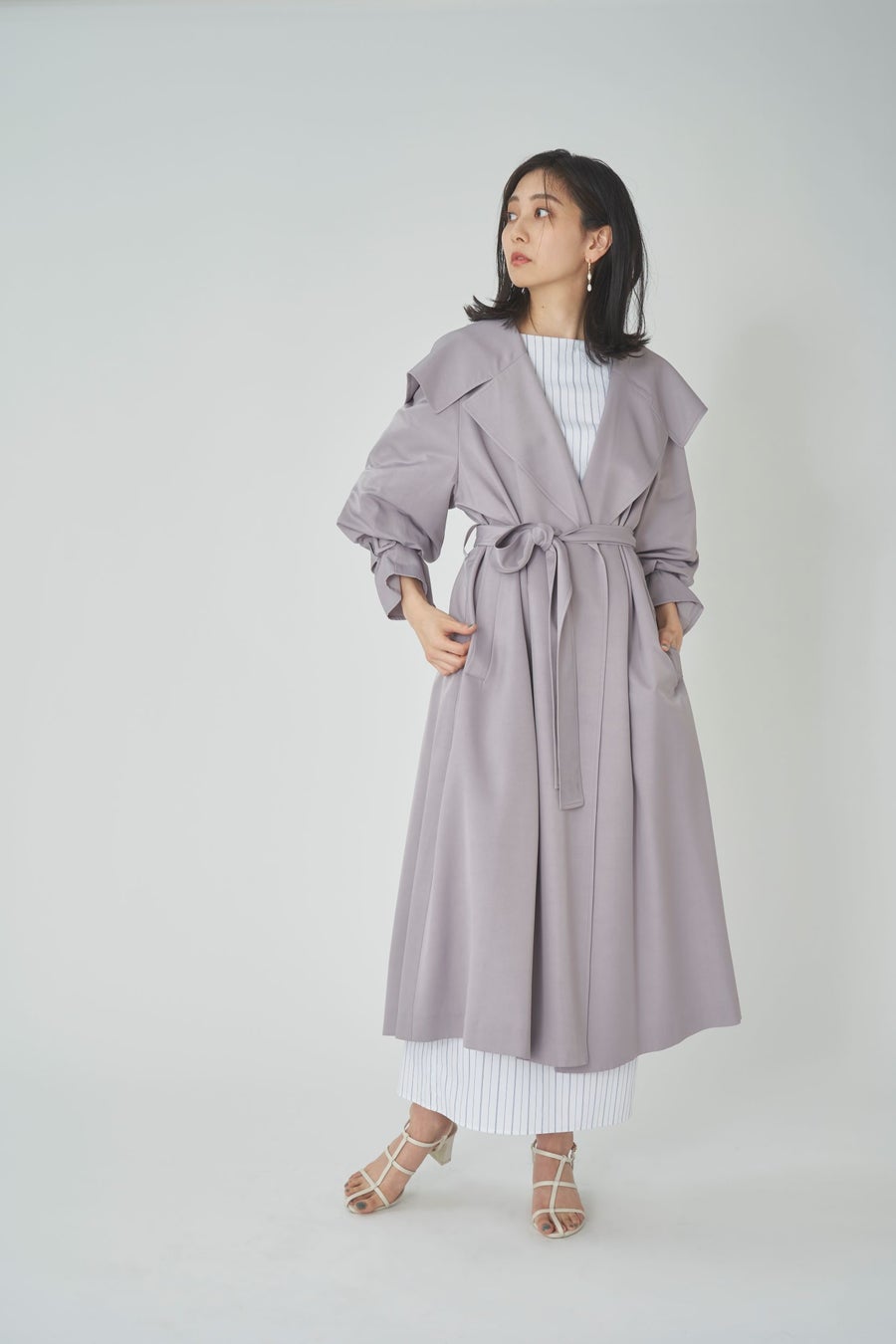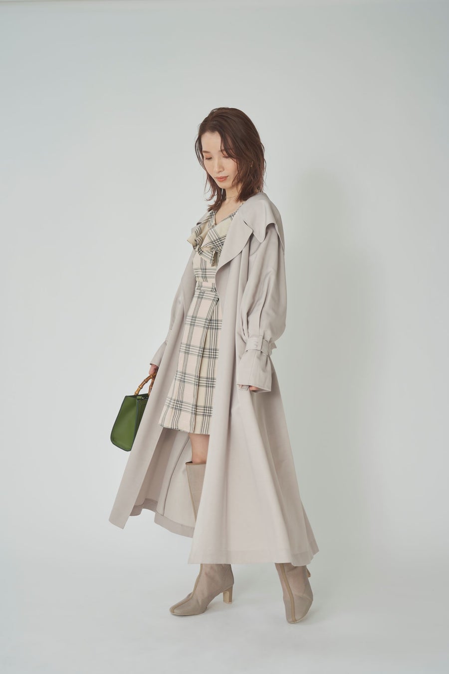 ウエストより高い位置にベルトループが付いているのでベルトを背中で緩めに結び、リボンがウエストの高さにくるよう調節します。袖はベルトを緩めて、すとんと落ちる縦長フォルムを意識。
