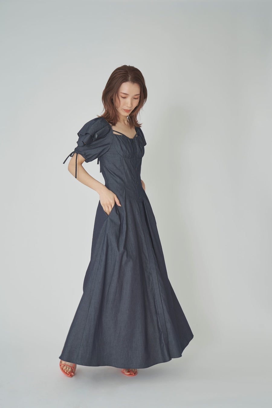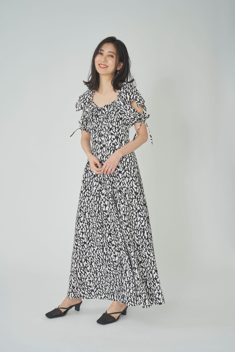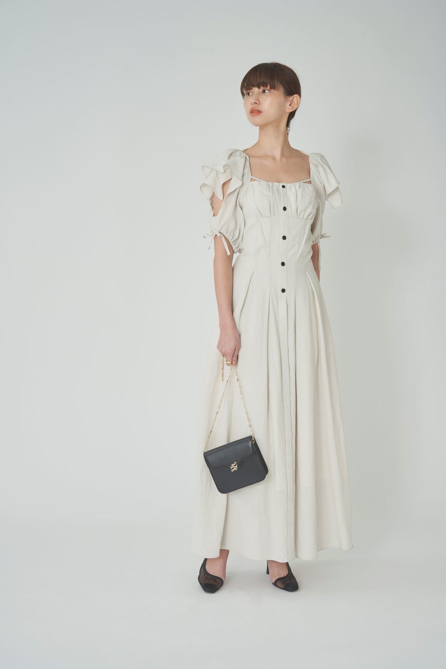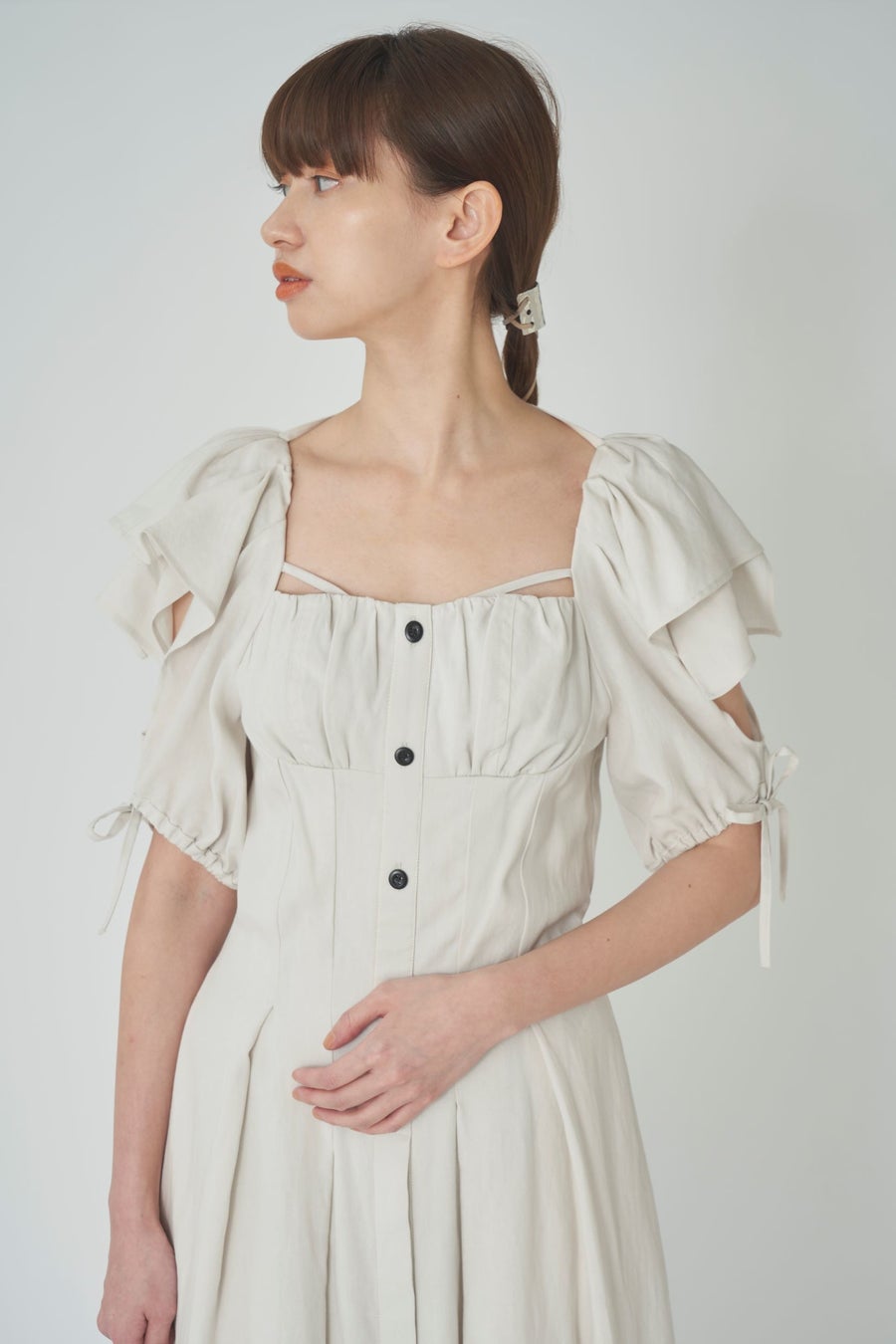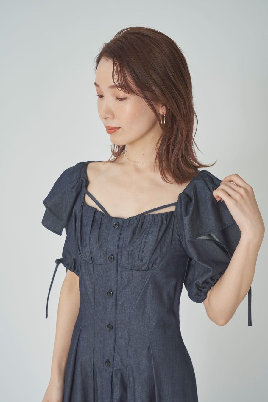 首元の紐の締め具合によって、デコルテの開きを調節できるワンピース。