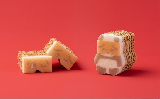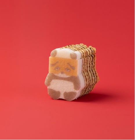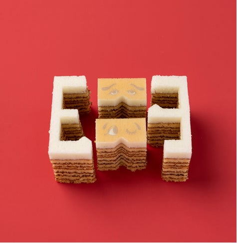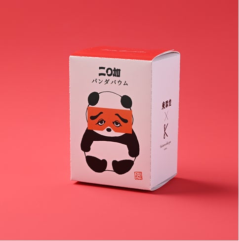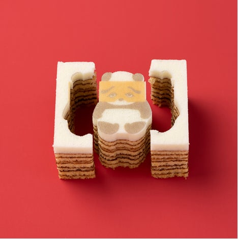 卵とアーモンドがほのかに香るプレーン生地を、何層にも丁寧に焼き重ねた平焼きバウム。そのバウムの一番上の白い生地をキャンバスにして、にわか面をつけたパンダのプリントとカットをほどこしました。