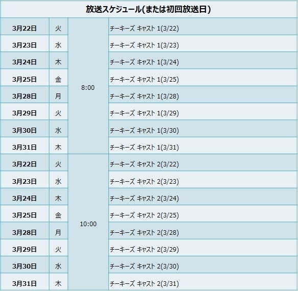 月曜~金曜、チーキーズ キャスト1をあさ8時~午前10時まで、チーキーズ キャスト2を午前10時~ひる12時まで、それぞれ2時間生放送いたします。