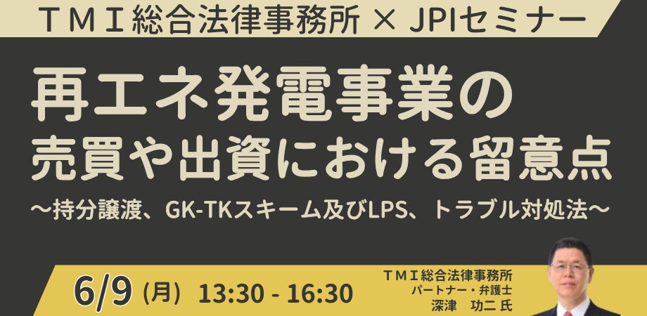 JPI(日本計画研究所)は、TMI総合法律事務所 パートナー・弁護士 深津 功二 氏を招聘し、再エネ発電事業の売買や出資における留意点について詳説いただくセミナーを開催します。