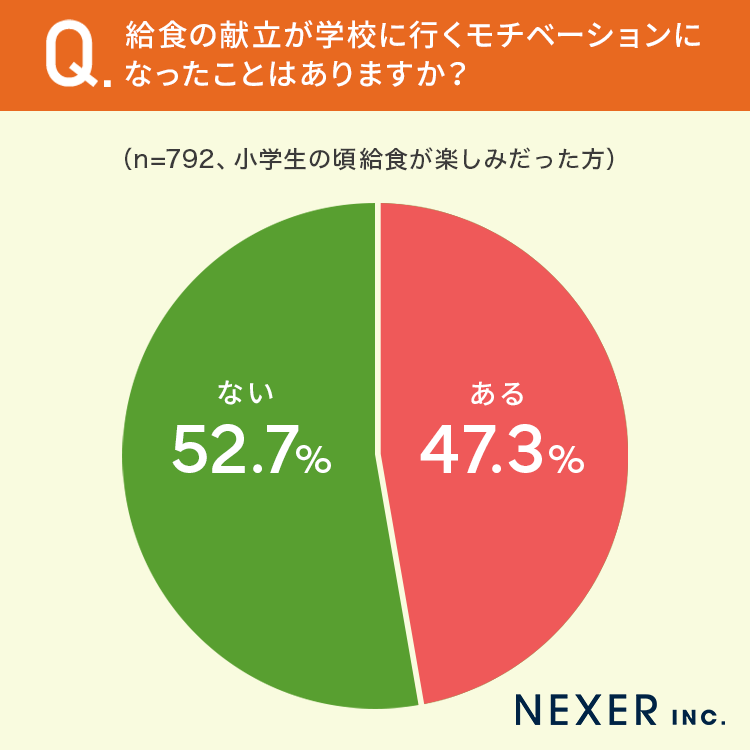47.3%と半数近くの方が、給食の献立が学校に行くモチベーションになったことが「ある」と回答しています。