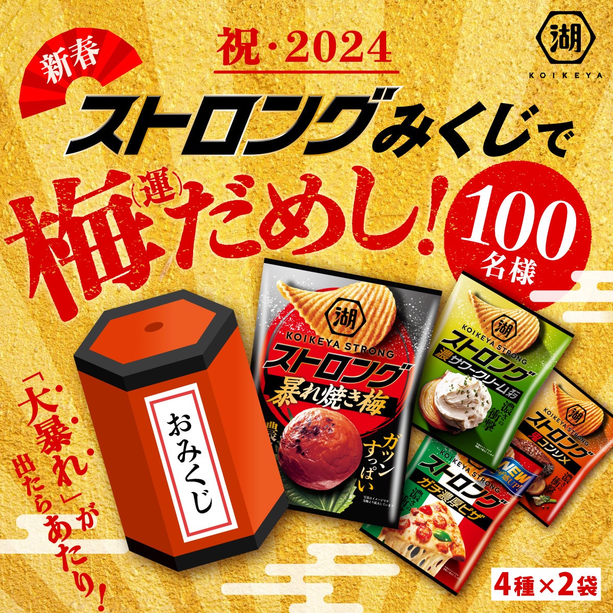 2024年の年始を飾る新商品「湖池屋ストロング ポテトチップス 暴れ焼き梅」の発売を記念して、当商品と「濃サワークリームオニオン」「ガチ濃厚ピザ」「鬼コンソメ」各2袋をセットにした計8袋を100名様にプレゼントするキャンペーンを実施します。今回のキャンペーンでは、「ストロングみくじ(おみくじ)」を引いて“大暴れ”が出たらあたり!年初の運だめしならぬ“梅”だめしに、ぜひチャレンジしてみてください!