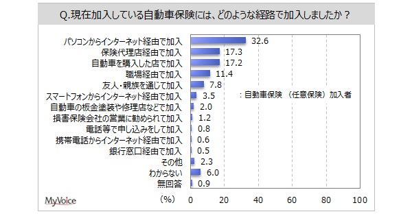 【自動車保険に関する調査】自動車保険の加入率は7割強。加入経路は「パソコンからインターネット経由」が加入者の3割強、「保険代理店」「自動車を購入した店」が各2割弱