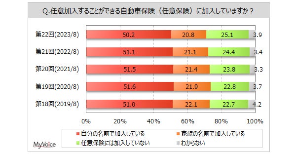 <今 回>(2023/8)https://myel.myvoice.jp/products/detail.php?product_id=30107 上記設問の他に「加入している保険会社の満足度」「自動車保険選定時の重視点」も聞いています。 <第21回>(2022/8)https://myel.myvoice.jp/products/detail.php?product_id=28908 <第20回>(2021/8)https://myel.myvoice.jp/products/detail.php?product_id=27708  |