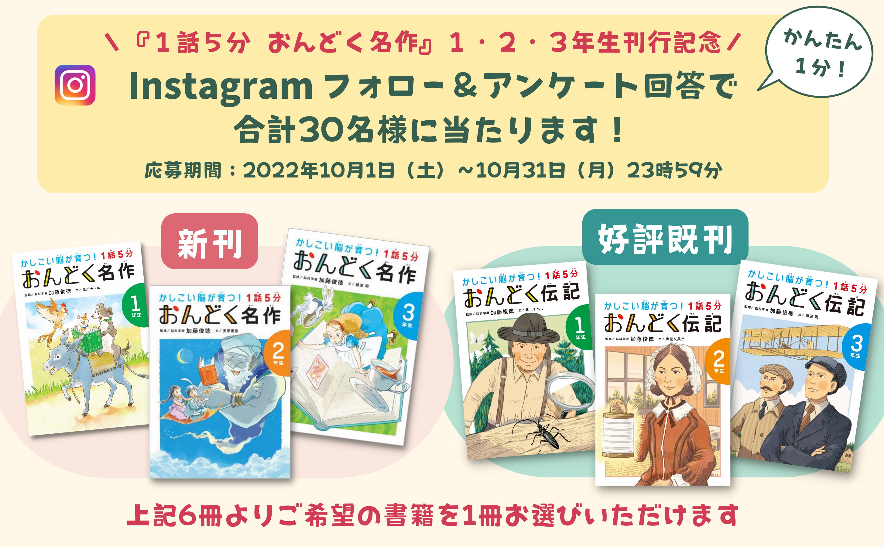 「読むのが苦手」というお子様にも読みやすく、脳が活性化する工夫を凝らした『1話5分 おんどく名作』1・2・3年生の発売を記念し、プレゼントキャンペーンを開催します。Instagramフォロー&アンケート回答で、抽選で合計30名様に、好評既刊『1話5分 おんどく伝記』、または新刊『1話5分 おんどく名作』よりご希望の書籍1冊を差し上げます。皆さまからのご応募、お待ちしております。