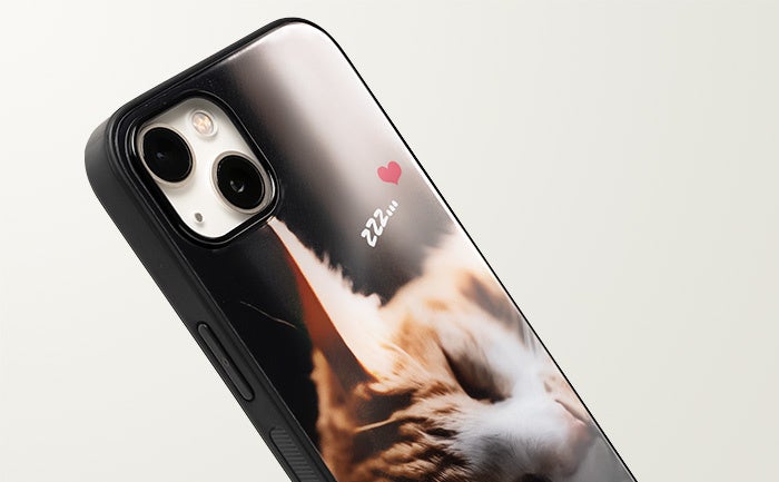 ケース内側にある強化ガラスの裏面にデザインを印刷するため、ケース表面に印刷面が出ることがなく、摩擦による印刷落ちが発生しません。ガラスの光沢がある美しい見た目とオリジナルデザインの印刷を綺麗な状態のまま維持できる点が最大の特長です。