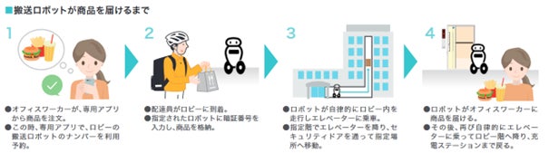想定利用例としては、フードデリバリーの自動運搬として、ロボットが1Fロビーで配達員から商品を受け取り、自律的にエレベーターに乗ってオフィスの注文者に直接届けるといった活用を想定しています。また、同時に導入された清掃ロボットは、自らエレベーターに乗って移動し、共用廊下部分の清掃ができます。