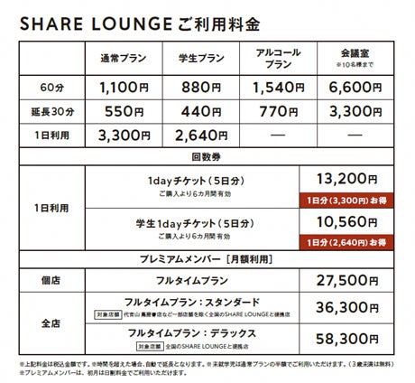 ■「SHARE LOUNGE 御旅屋セリオ」料金表