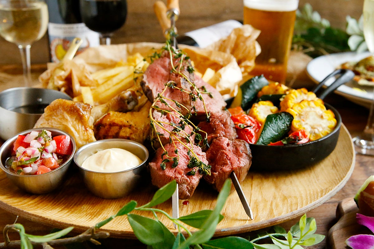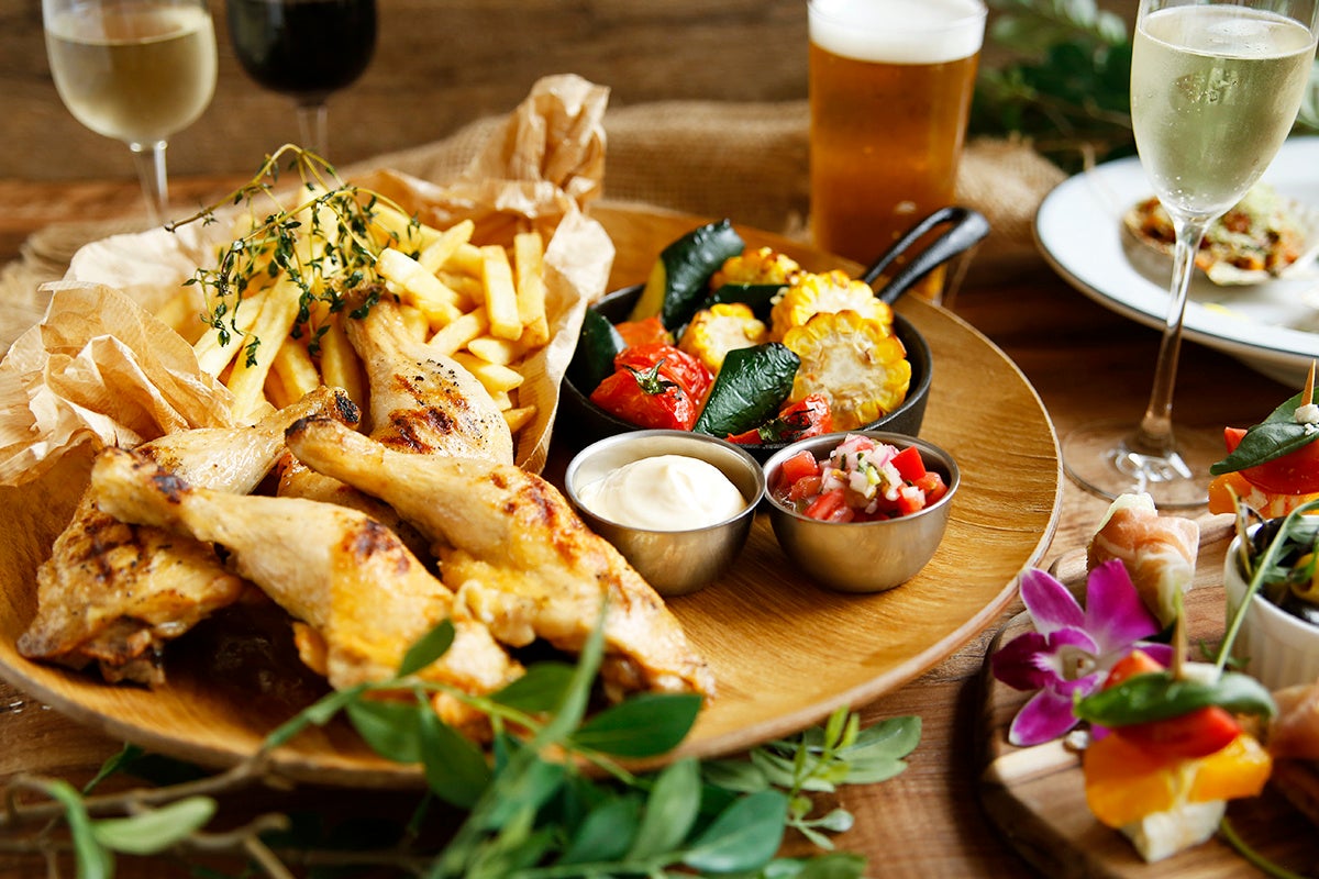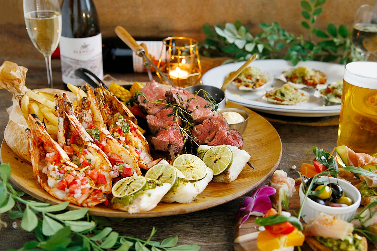 シェフこだわりの前菜5種のプレートと、メインプレートをご用意しました。メインプレートは、スパイシーチキン、ビーフブロシェット、シーフードの3種からお好みのメインプレートをお選びいただけます。出来立てを、テーブルにお持ちいたします。