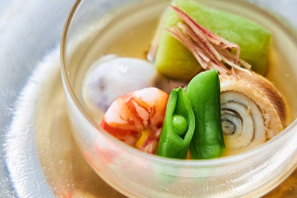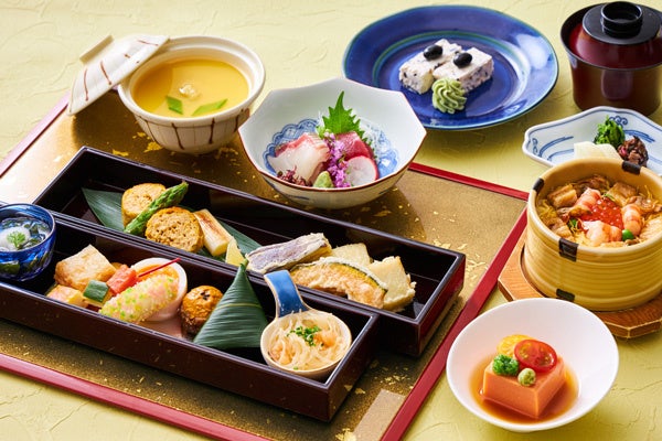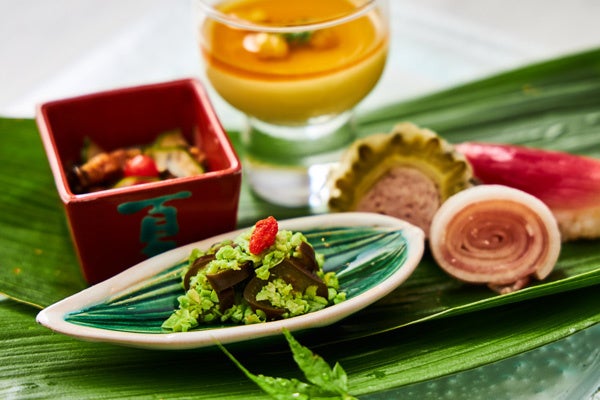 季節感に溢れ、見た目も美しい旬の食材を使った料理が楽しめる、全7品の昼会席をご用意いたします。中でもお椀では、箸がスッと通るほど柔らかく煮込んだ旬の冬瓜と、滋養強壮の効果が高いすっぽんをしっかりと煮込んだ暑い季節を乗り切るのにぴったりな一品に仕上げました。ひんやりとした感覚とたっぷりと出汁を含んだ翡翠茄子が、口の中いっぱいに広がる夏限定の冷たい煮物を楽しんだ後は、太刀魚と野菜を湯葉で包んで揚げる“東寺揚げ”と“海老真丈の挟み揚げ”をご堪能ください。締めくくりはホテルパティシエ特製のデザートをご用意いたします。黒豆と胡麻を使用し、和のテイストを入れたイタリアの冷たいデザート「セミフレッド」をお楽しみください。