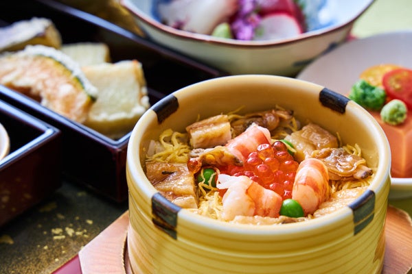 五味五法を意識し、彩り美しく見た目も華やかな「花むさし」の人気のランチメニューです。今回は赤色が目を引く、トマト胡麻豆腐や、とうもろこしの茶碗蒸し、枝豆真丈と夏野菜を使用した天麩羅などをお楽しみいただけます。食事には「蒸し寿司」をご用意いたします。蒸すことで、酢の酸味がまろやかになり、マイルドな口当たりをぜひご堪能ください。