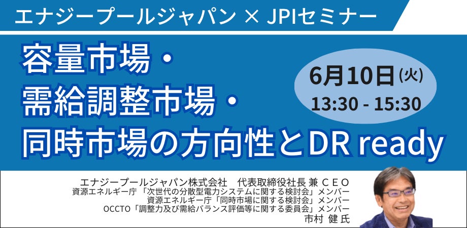 JPI(日本計画研究所)は、エナジープールジャパン株式会社 代表取締役社長 兼 CEO 市村 健 氏を招聘し、容量市場・需給調整市場・同時市場の方向性とDR readyについて詳説いただくセミナーを開催します。