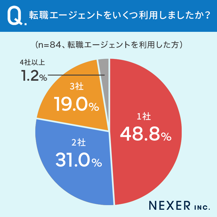 続いて「転職エージェントを利用した」と回答した方に、転職エージェントをいくつ利用したのか聞いてみました。