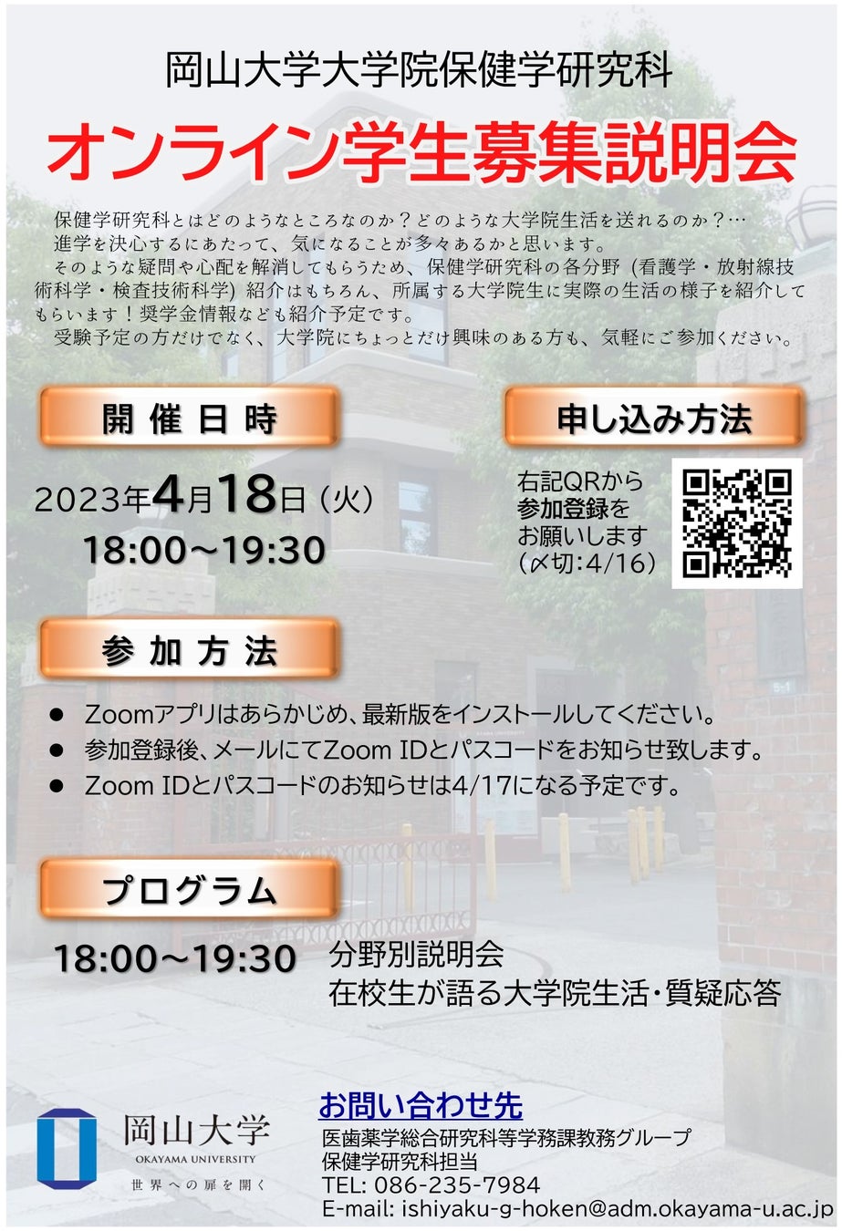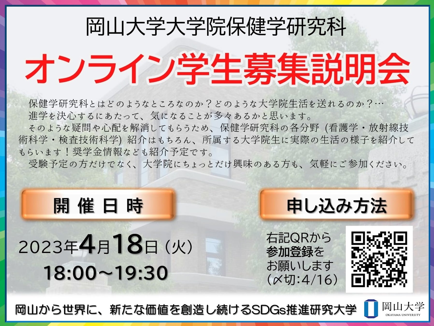 【岡山大学】大学院保健学研究科 オンライン学生募集説明会〔4/18,火〕