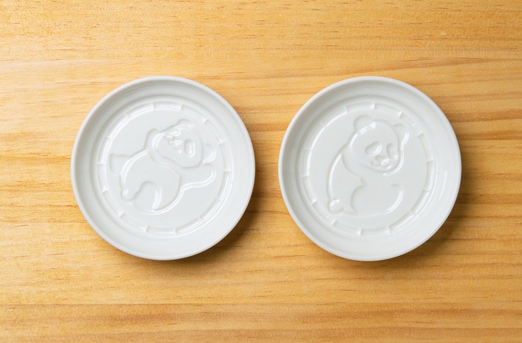 シャオシャオとレイレイのかわいい姿が浮かび上がるユニークなデザイン。裏面にはふたごの誕生日と名前をプリント。ふたごにちなんで2 個セットになった、本誌限定の特製しょうゆ皿です。