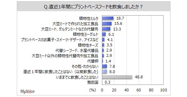 直近1年間にプラントベースフードを飲食した人は4割強です。飲食したものは(複数回答)、「植物性ミルク」が18.7%、「大豆ミートで作られた加工食品」が15.6%、「大豆ミート、グルテンミートなどの代替肉」が13.3%となっています。