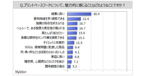 プラントベースフードについて魅力的に感じることは(複数回答)、「健康に良い」が40.4%、「食物繊維を多く摂取できる」が22.4%、「脂質の吸収を抑えられる」「ヘルシーで、ある程度の満足感が得られる」「高たんぱく低カロリー」「良質な植物性タンパク質を摂取できる」が15~17%となっています。