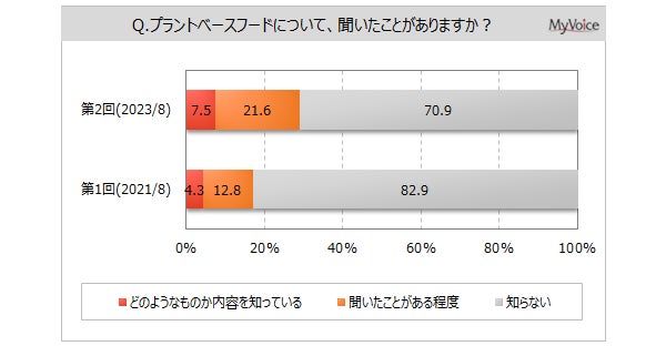 | <今 回>(2023/8)https://myel.myvoice.jp/products/detail.php?product_id=30103 上記設問の他に、「プラントベースフードを飲食したきっかけ・理由」も聞いています。 <第1回>(2021/8)https://myel.myvoice.jp/products/detail.php?product_id=27704 |