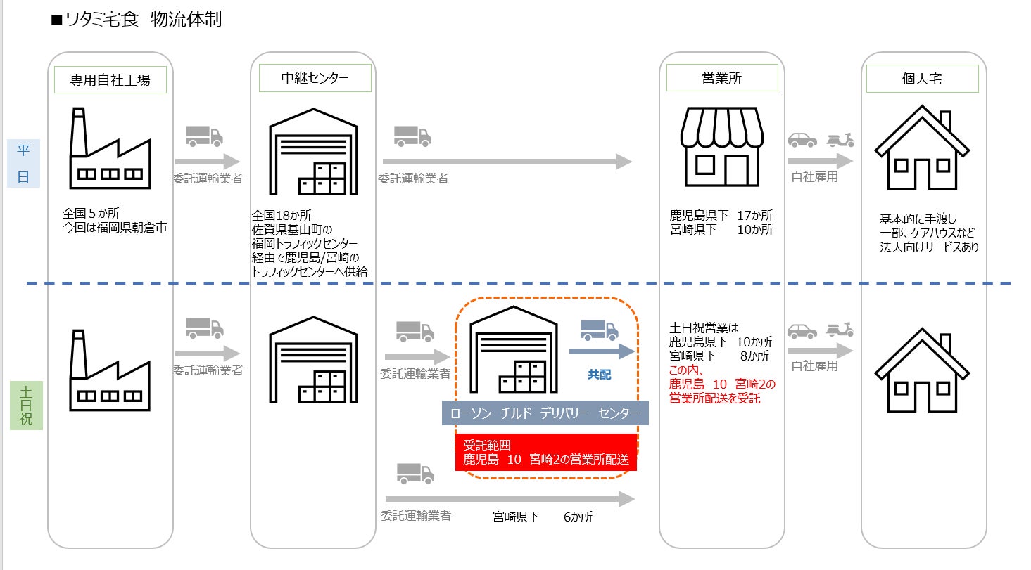 今回開始する取り組みでは、「ワタミの宅食」商品の納品数が少ない土・日・祝日に、ローソンの配送トラックにローソン店舗向けの商品と「ワタミの宅食」の商品を積み込み、ローソンの物流センターからローソン店舗とワタミの12の営業拠点(宮崎2拠点、鹿児島10拠点)へ900食(1日平均)を配送します。ワタミの営業拠点をローソンの配送コース(12コース〈宮崎2コース、鹿児島10コース〉)に組み込んで納品することにより、配送効率の向上を実現します。