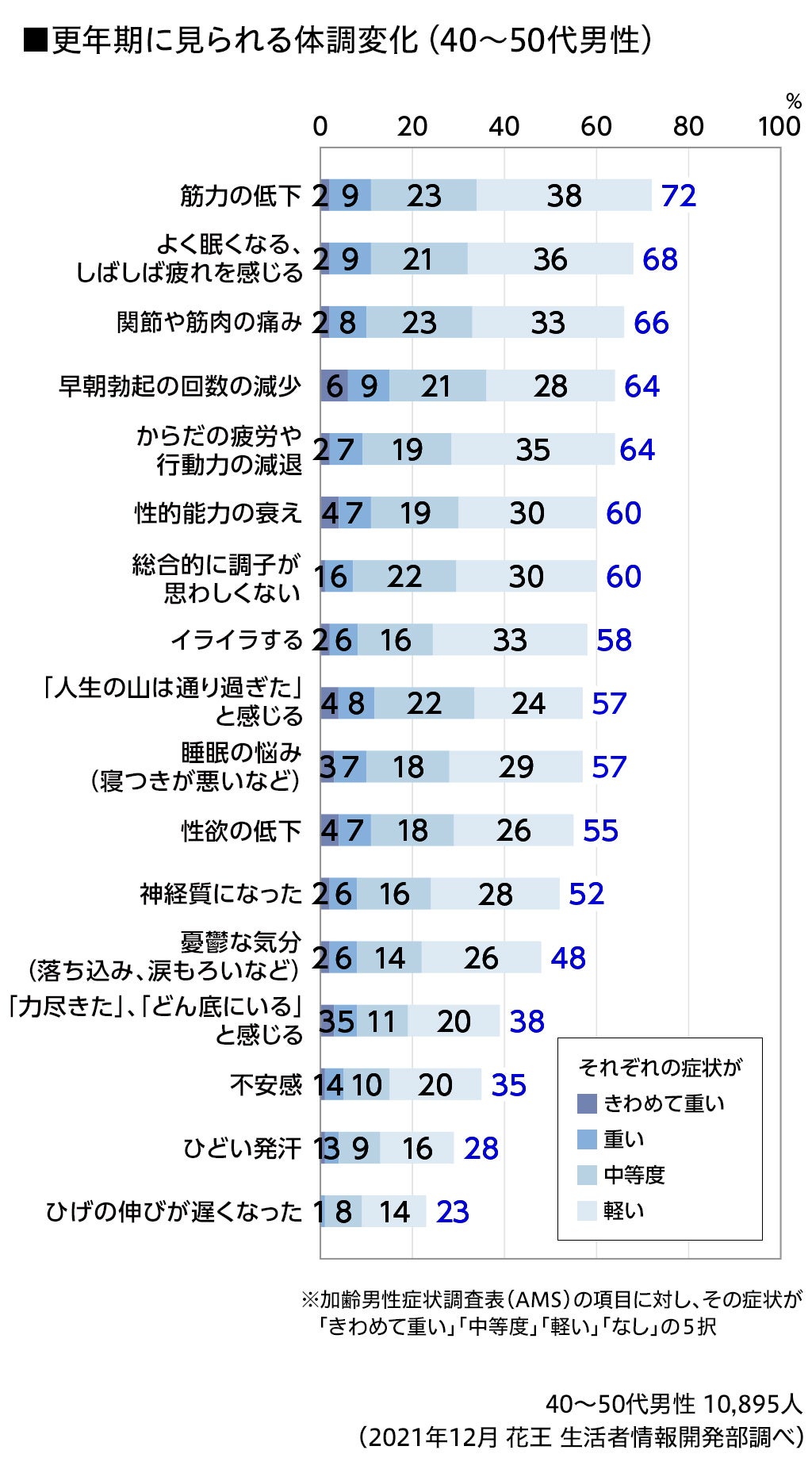 男性ホルモンの急激な減少によって起こる男性更年期の症状は、実に多様です。女性でイメージする症状と異なるものも多くあり、「筋力の低下」や「睡眠の悩み」、「イライラする」や「憂鬱な気分」といった、心と体の両面で症状として現れます。加齢男性症状調査表(AMS)のセルフチェック項目の症状でみると、「筋力の低下」(72%*)や「よく眠くなる、しばしば疲れを感じる」(68%*)、「関節や筋肉の痛み」(66%*)、「早朝勃起の回数の減少」(64%*)など、40~50代男性の半数以上が自覚する症状も多くありますが、加齢による症状と思われがちなことから、自分では更年期の可能性を疑いにくいのかもしれません。