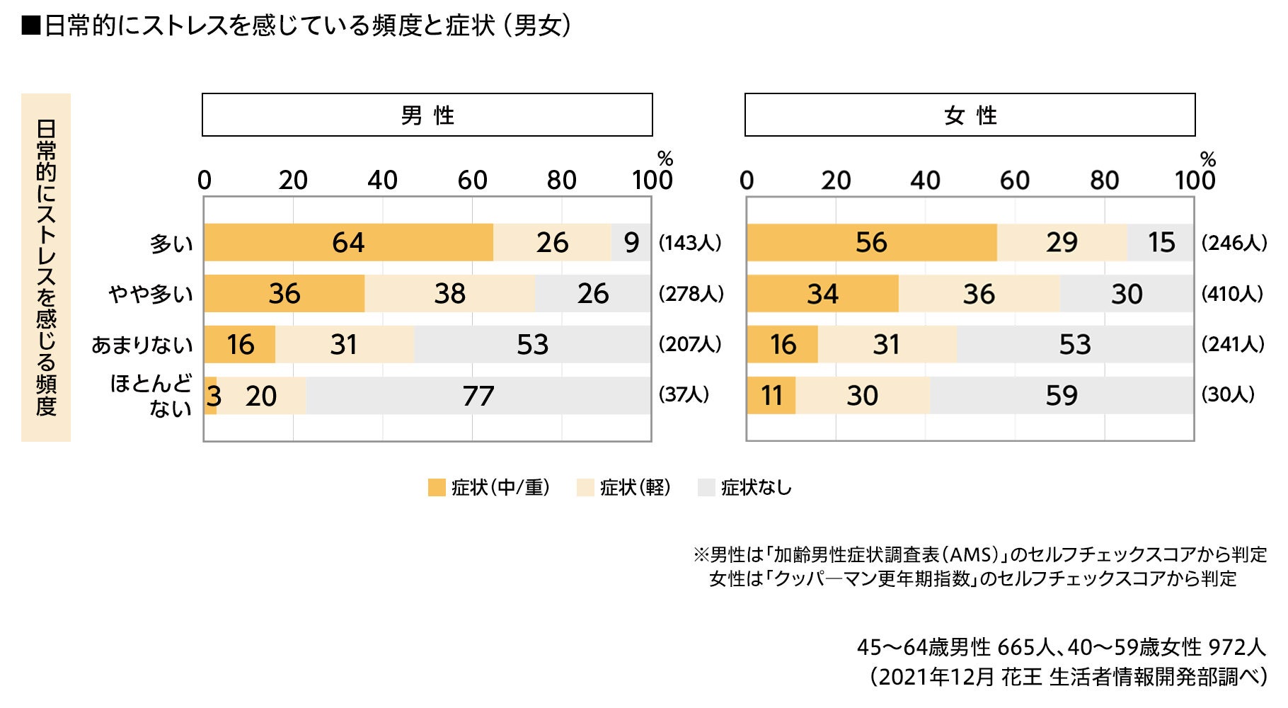 日常的にストレスを感じる頻度と、更年期症状の中等・重症の割合を見ると、ストレス頻度が「多い」では男性64%、女性56%、「やや多い」では男性 36% 女性 34%と、男女ともに、頻繁にストレスを感じている人ほど、症状が重い傾向にあります。男性がストレスを感じる大きな原因は、「仕事上の人間関係」(54%)、「仕事の大変さ」(48%)、「将来や老後の不安」(32%)と仕事中心。年齢が上がり重責を負うことがストレスになったり、つい仕事を優先して自分の不調を後回しにしがちになったりする可能性も考えられます。