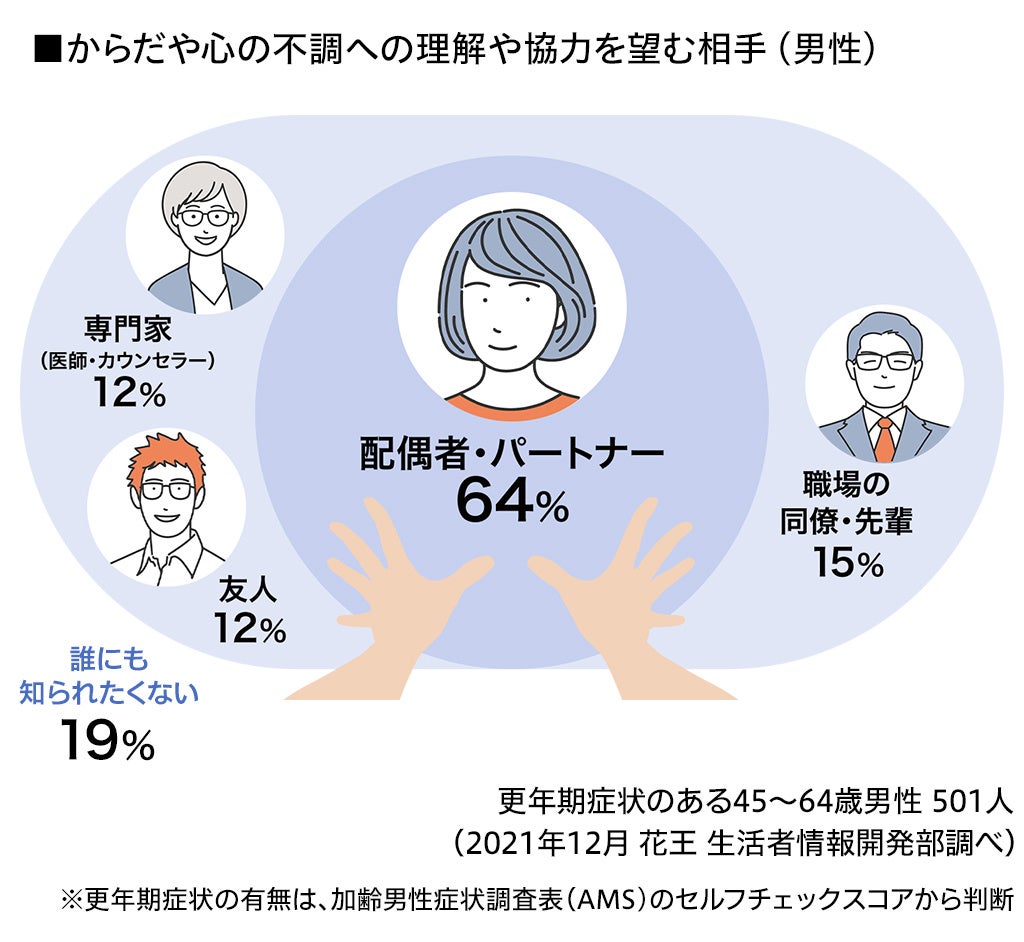 更年期に対する理解があり、前向きに対処する男性はまだ少数派のようですが、不調であることを「誰にも知られたくない」と考える人は19%でした。約8割の男性は、からだや心の不調について、誰かに理解や協力を求めています。その1番の相手は、「配偶者・パートナー」で64%でした。女性は、友人や母親、娘など他にもさまざまな相手がいるのに対し、男性は圧倒的に配偶者・パートナーに集中しています。男性更年期については、知識や理解も人それぞれで、全く知らない人もいます。不調に対する悩みや対処方法などをオープンに話せる状況にないことも、男性が更年期不調になかなか向き合えない要因となっているのかもしれません。