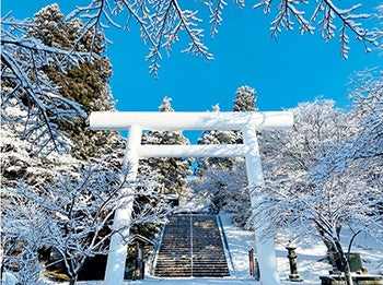 印象的な純白の大鳥居、春は桜、夏は青もみじ、秋は紅葉、冬は枯れ木に咲く「雪の花」と一の鳥居の白さが一層際立つ美しさに。創建は1675年。主祭神は会津藩初代藩主保科正之公。境内には22畳分の面積の石碑や静謐(せいひつ)な空気が流れる正之公の奥津城(墓)があり、こどもと出世の神さまとして親しまれている。