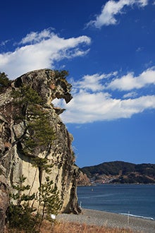 巨大な獅子が熊野灘に向かって咆哮する獅子のような姿をした高さ25mの奇岩は、国の名勝・天然記念物であり世界遺産に。井戸川上流に位置する大馬神社のこま犬として愛され、南側に位置する神仙洞の吽(うん)の岩(雌岩)に対して阿(あ)の岩(雄岩)と呼ばれている。