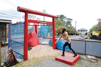 鳥居から拝殿まで、ずっしりと重い釜蓋を頭に乗せて祈りながら落とさずに歩ききる願掛けが人気。拝殿までは約10m。勝負事の神スサノオノミコトを祀った神社で、岩の上の釜に小さい釜蓋が入れば願いが叶うという難易度の高いチャレンジ型の願掛け体験も。