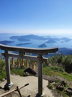 天草諸島の最高峰、倉岳山の山頂に建つまさに「天空の神社」。360度のパノラマ絶景が広がり、八代海に浮かぶ御所浦の島々や、振り返ると山々の先に有明海、さらに島原半島まで望むことができる。また、神社の左手には展望台があり、知る人ぞ知る穴場絶景を独り占めすることも!