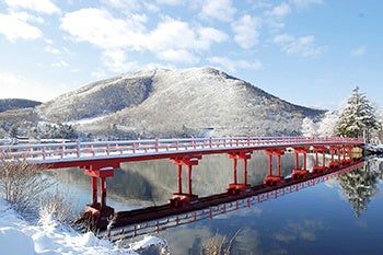 標高1300m余りの大沼湖畔に位置し、多くの伝説が残る古社。赤城姫をお祀りしており、女性の願い事を叶えてくれることで有名。真っ赤な社殿と神橋「啄木鳥橋」がシンボル。現在、老朽化により橋の通行は禁止ですが、周囲の大自然と調和する風景はまるで絵画のようで、眺めるだけでも美しい。