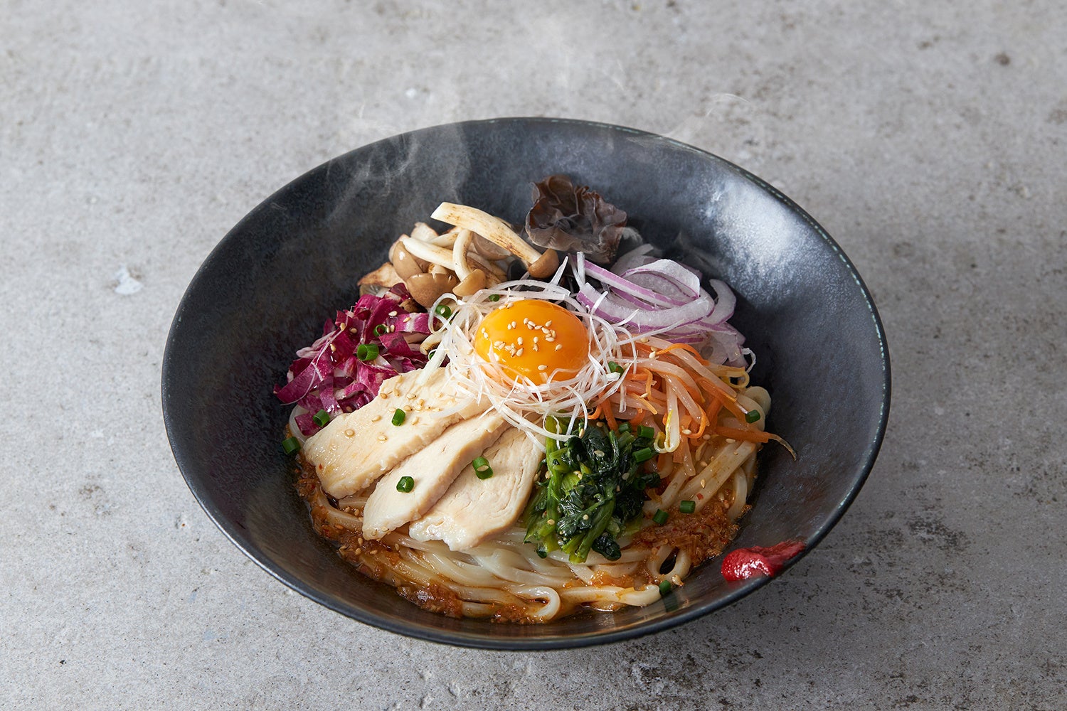 鶏むね肉と10種野菜のピリ辛胡麻だし温うどん