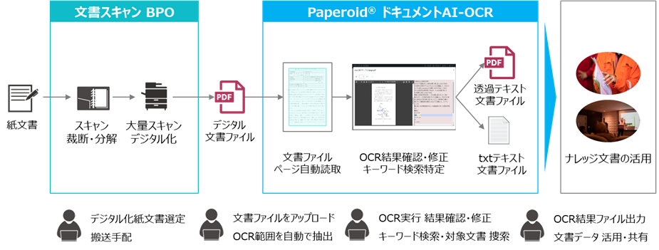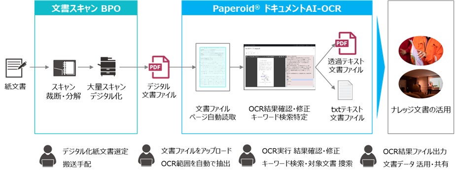 当社グループが提供する紙文書のスキャニングプロセスをアウトソーシングできる文書スキャンBPOと、あらゆるフォーマットから文字箇所を定義せずにOCRすることが可能なTISのPaperoid®の「ドキュメントAI-OCRサービス」を組み合わせ※1一気通貫でご提供します。