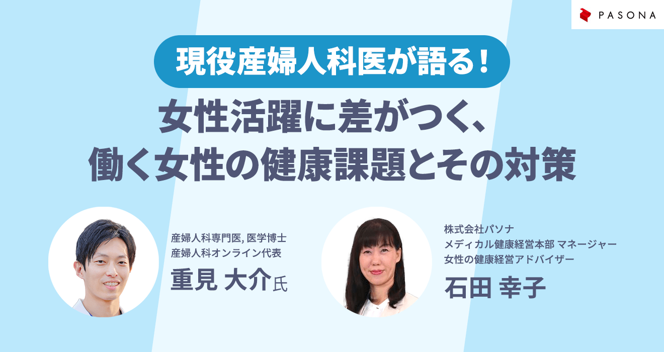 そこでこの度パソナは、オンラインセミナー『現役産婦人科医が語る!女性活躍に差がつく、働く女性の健康課題とその対策』を開催。女性従業員の健康リテラシー向上やプレゼンティーズム※4の改善方法、がん検診受診における啓蒙活動のポイントなどについて紹介いたします。また、累計10万件以上の女性の健康課題に対する相談対応を行い、雑誌やテレビ等でもフェムテック・女性の健康に関する有識者として活躍する産婦人科専門医・医学博士 重見大介氏をお招きし、働く女性の健康課題とその対策について分かりやすく解説いたします。