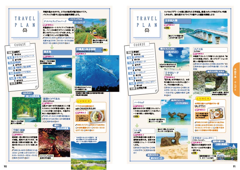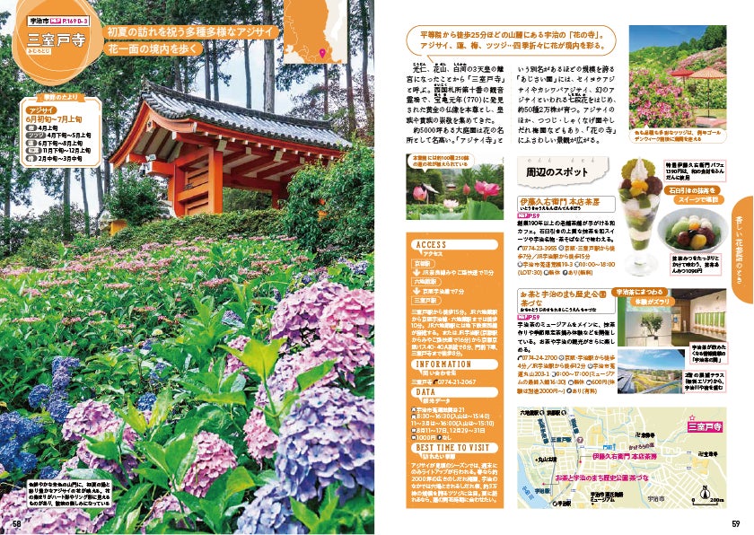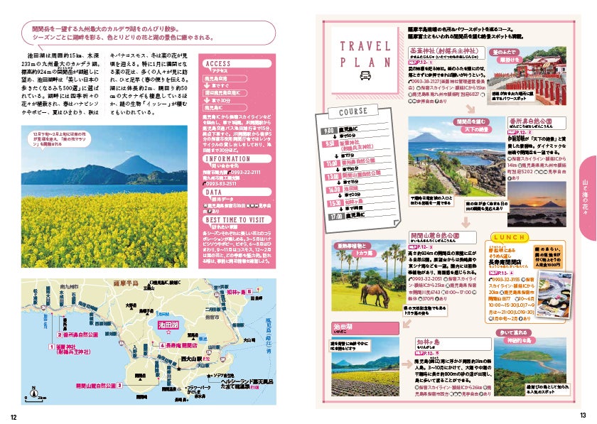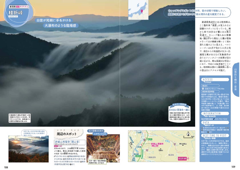 各スポットには、最適な訪問時期を示す「季節のたより」やその地の豆知識、詳細な地図、周辺スポットを掲載。また、複数の絶景を一日で満喫できるオススメの旅行プランも数多く掲載し、写真・情報量どちらも充実しています。