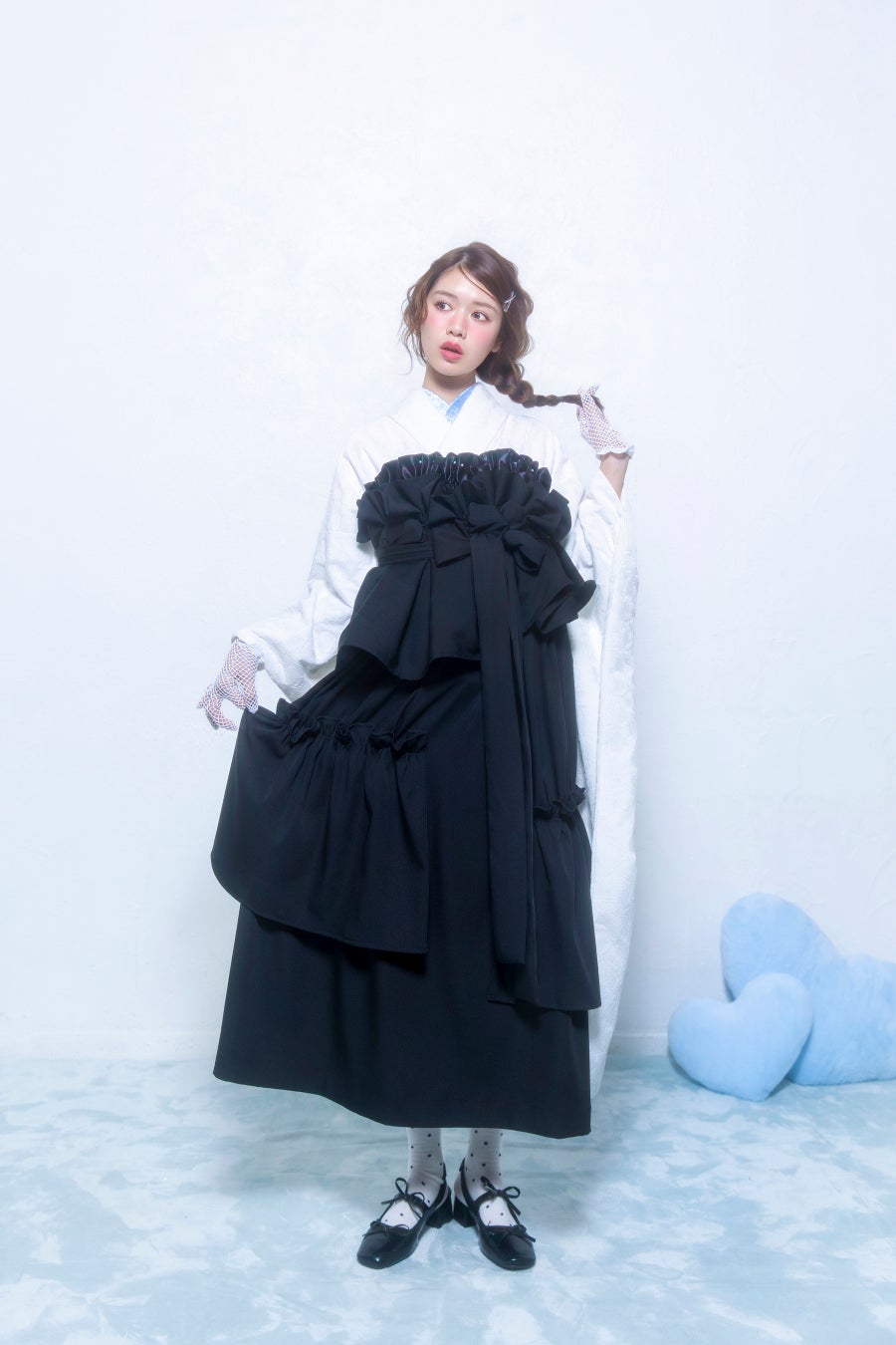 伝統的なお着物に、レースやフリルをレイヤードした、ガーリーでエッジの効いた着こなし。