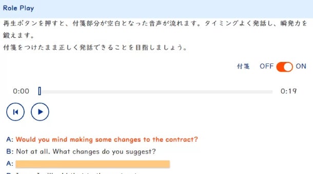 役になりきって発話する「Role Play」や、会話をイメージして対話文を聴く「Repeat」など、今すぐ使える英文法・フレーズを身につけ、実践力を高めます。