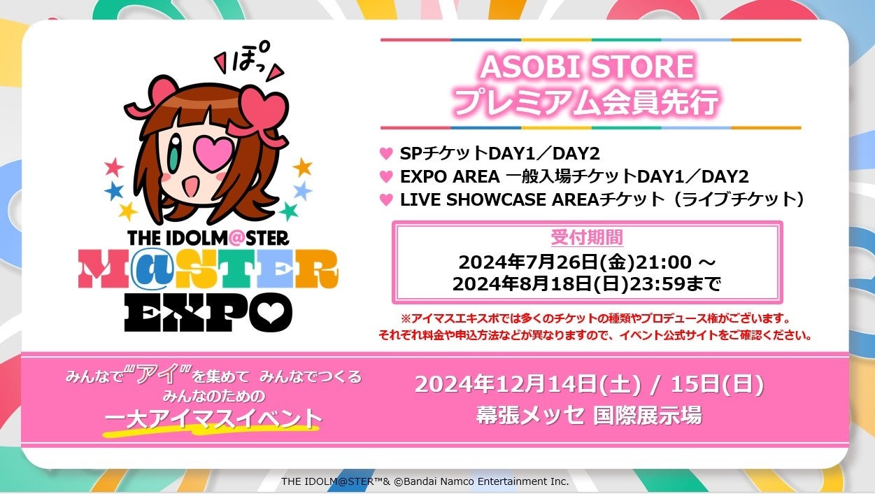 株式会社バンダイナムコエンターテインメントは、2024年12月14日(土)・15日(日)に幕張メッセにて、「アイドルマスター」シリーズ 20周年イベント「THE IDOLM@STER M@STER EXPO」を開催致します。