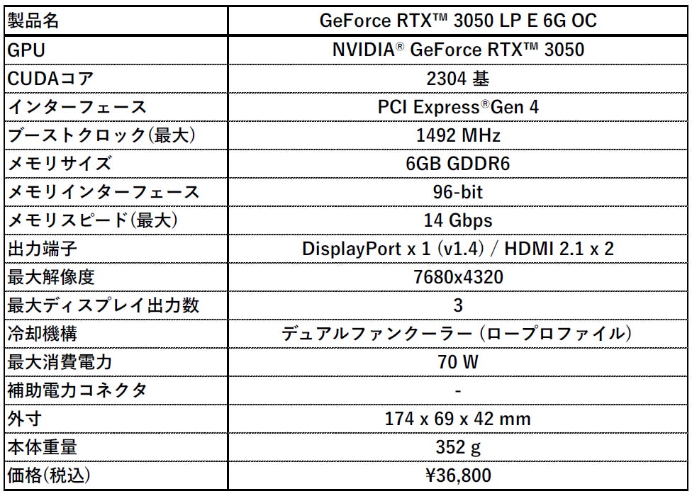 【GeForce RTX™ 3050 LP E 6G OCの主な特徴】