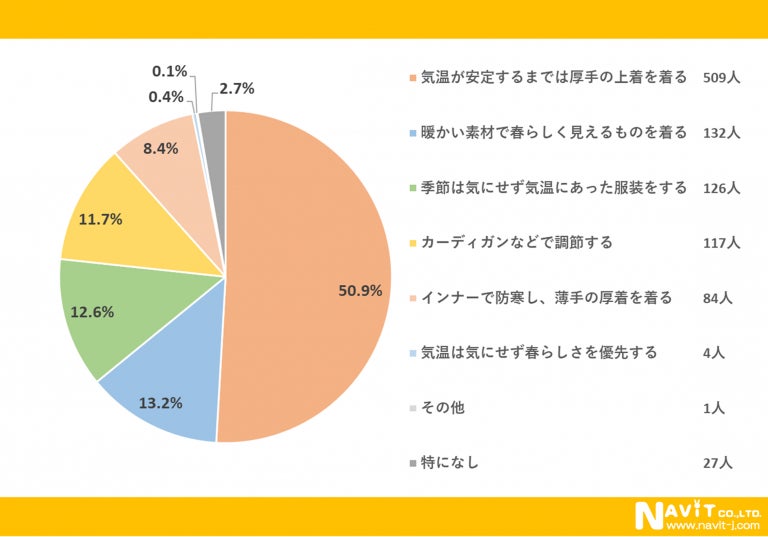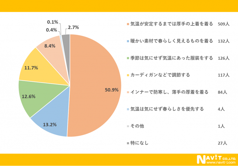 「春は温度差が激しい季節ですが、服装はどうしていることが多いですか?」という質問については、「気温が安定するまでは厚手の上着を着る」が50.9%、「暖かい素材で春らしく見えるものを着る」が13.2%、「季節は気にせず気温にあった服装をする」が12.6%という順になりました。