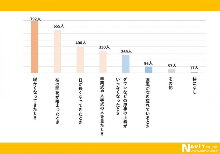 「どんな時に春を感じますか?」という質問を複数回答可で行ったところ、「暖かくなってきたとき」が792人、「桜の開花が始まったとき」が655人、「日が長くなってきたとき」が400人という順になりました。