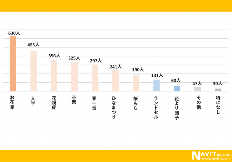 「春といえばどのような言葉を連想しますか?」という質問を複数回答可で行ったところ、「お花見」が630人、「入学」が455人、「花粉症」が356人という順になりました。