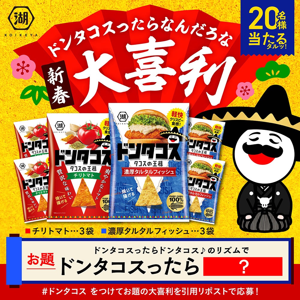 コイケヤ【公式】(@koikeya_cp)をフォローしていただいた上で、【#ドンタコス】のハッシュタグをつけて、「ドンタコスったら〇〇」に当てはまる言葉を自由に考えて、お題の大喜利を引用リポストしてください。